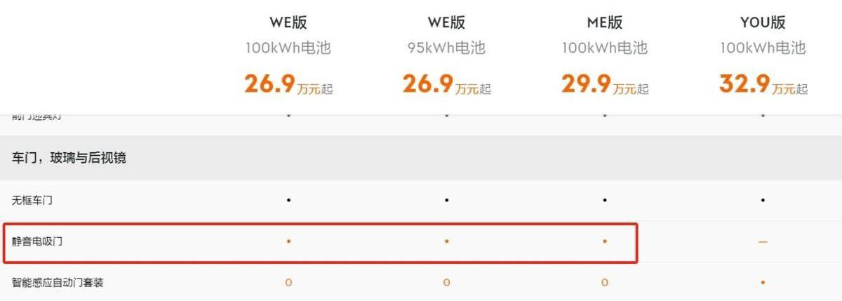 让我们先从入门版的WE版开始,在这个配置里,不论是100kWh电池还是95kWh的电池,都是26.9万元,但是需要注意的是,100度电池包对应的是后驱版本,而95kWh对应的则是四驱版本。这点其实就非常好选择,就看你想要长续航,还是高性能。并且两种电池包对应的充电速度也有所不同,最求更快的充电速度和效率的,选95度神行电池版本绝对没错。