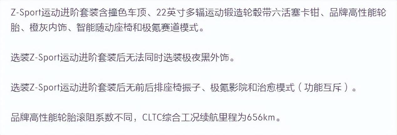 当然,在YOU版上,选配的项目就更加不一样了,在这个配置上,你可以选装Z-Sport运动进阶套装(包含22寸多幅轮毂+6活塞Brembo刹车卡钳+大尺寸打孔制动盘)、橙灰内饰+随动座椅(带侧翼自动调节)、高性能轮胎以及赛道模式。怎么样,听到这么多配置是不是很激动,但这套运动套装的选装价是3.5万元。但是选择了Z-Sport套装,则会取消治愈模式以及座椅振子(功能互斥)。但是电动拖车钩、车载卫星通讯依旧需要单独选装。