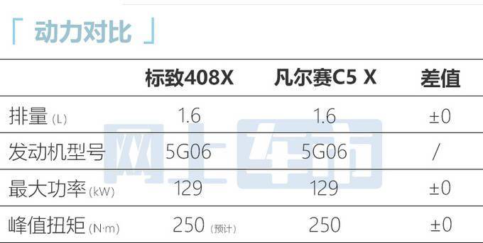 标致408X车身尺寸在海外版基础上全面升级,并换搭型号为5G06的1.6T发动机,最大净功率129kW,比标致408搭载的同排量发动机账面参数更高。参考雪铁龙凡尔赛C5 X,预计其峰值扭矩可达250N·m。