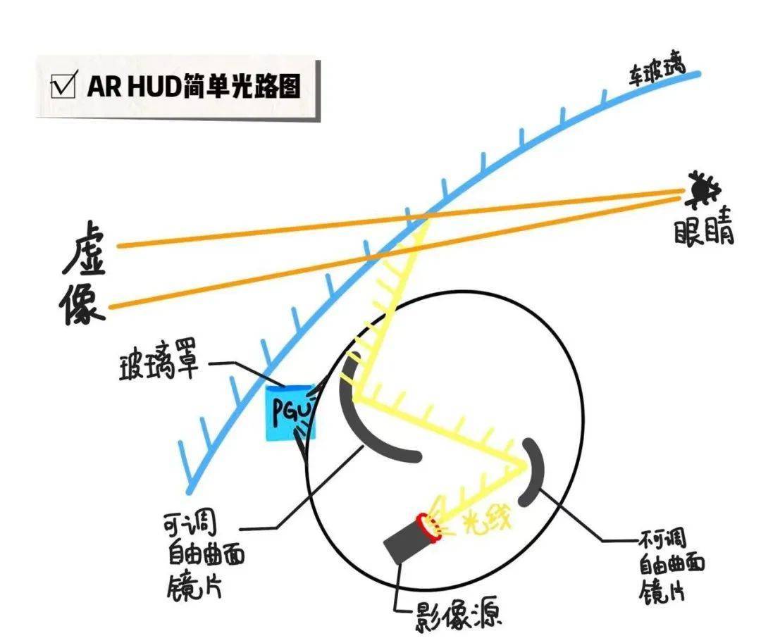 这三种HUD主要都是由图像生成单元(PGU)和光学显示系统两部分组成。例如AR-HUD的成像方式,布灵简单地画了一下: