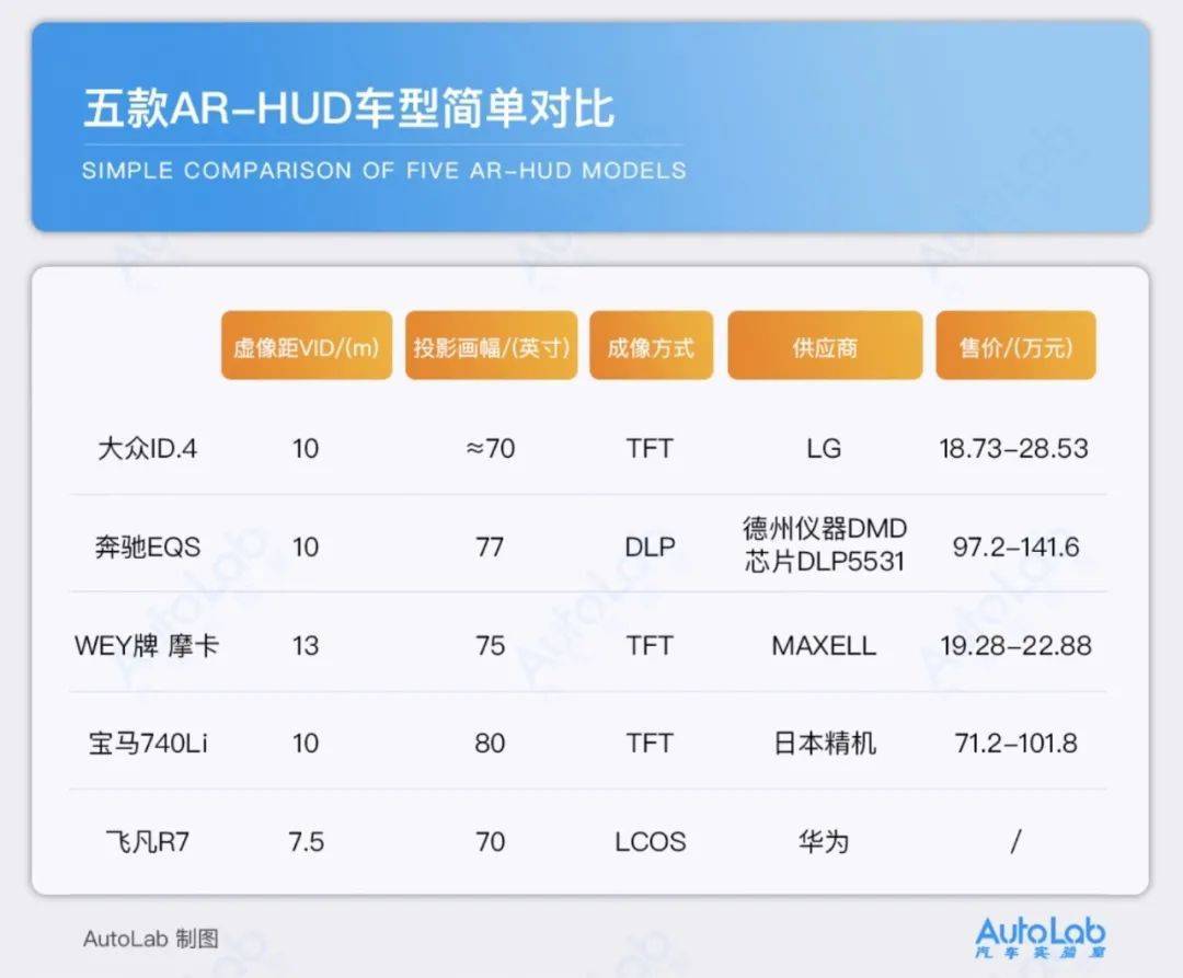 目前AR-HUD凭借更远的成像距离,更大的投影视场角,成为了主流发展趋势。布灵也整理了五款搭载AR-HUD的车型做了简要对比(由于有几款车型没有对应的视场角数据所以表格中未出现):