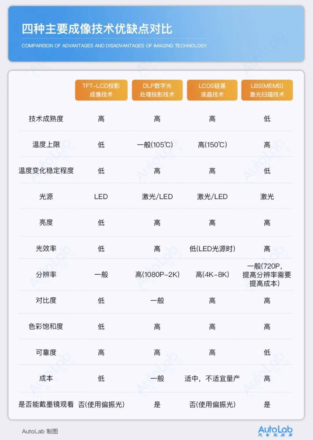 通过简单的示意图能感受到,其实最影响视觉体验的是影像源。影像源部分的成像技术主要分为TFT,DLP,LCOS和LBS这四种形式。我们不需要知道它们具体的成像原理,但是我们可以了解一下它们的优劣对比。