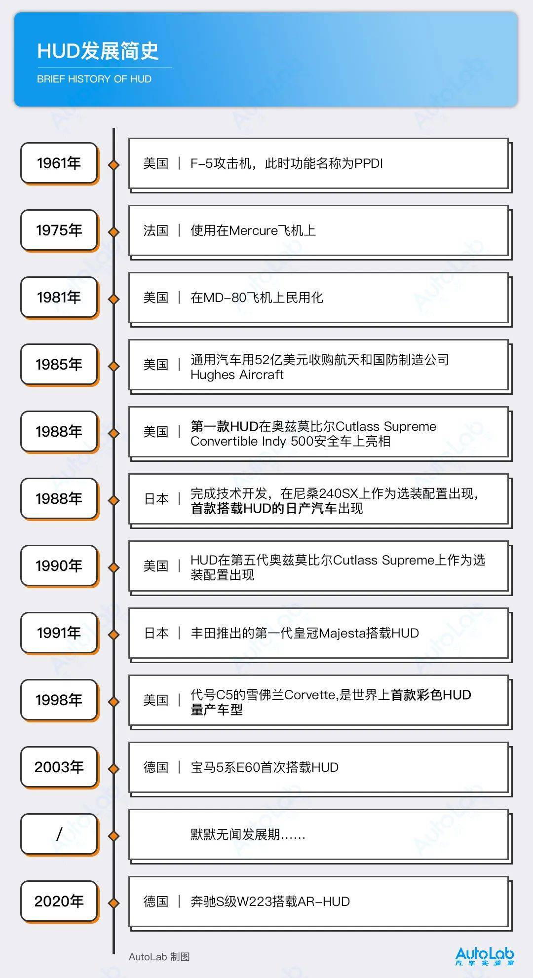 从表格中可以看出,HUD从飞机应用到汽车上花费了27年,而从第一款应用到汽车上的HUD发展到第一款AR-HUD的出现则是花费了32年之久。