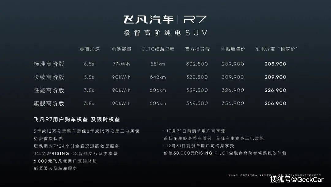 此外,飞凡 R7 全系标配换电架构,以车电分离商业模式,支持用户自由选择整车购买模式或电池租赁模式,降低了买车的门槛。