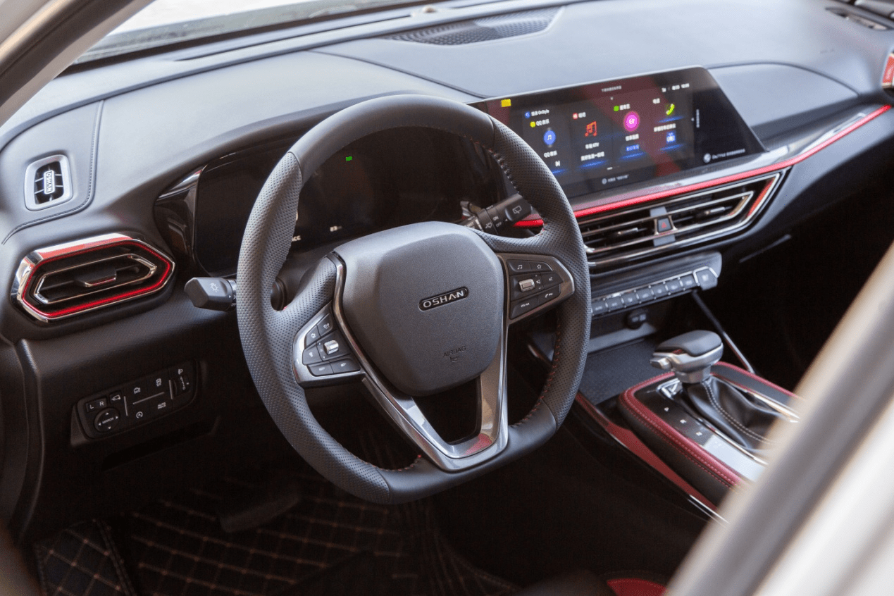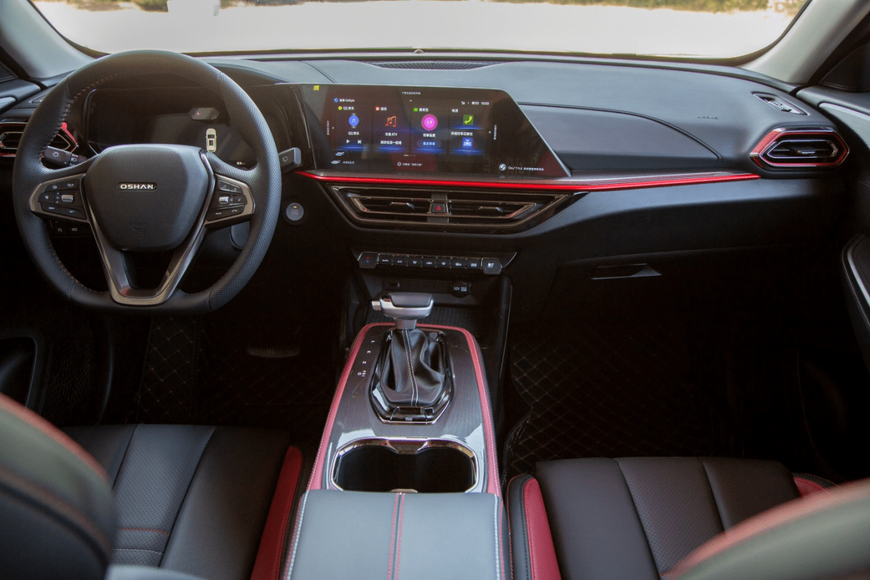 从内饰来说,两款车都属于10万级SUV中水准较高的一类,不过正如外形的迥异一样,内饰也是能看出来这种不同。欧尚X5更具运动感,在座椅的侧裙、中控台、空调出风口、车门等位置,都使用了或橙色、或红色和金色的装饰条,整车运动感十足,甚至在方向盘中央,也包裹了彩色装饰条,这种强化方向盘回正指示的标识,来源于拉力赛车。而方向盘右侧那颗“S”按键,是欧尚X5“超车模式”的启动按钮,它可以更改车辆的ECU逻辑,让发动机在短时间内爆发出更强的动力。