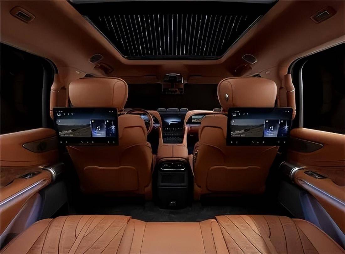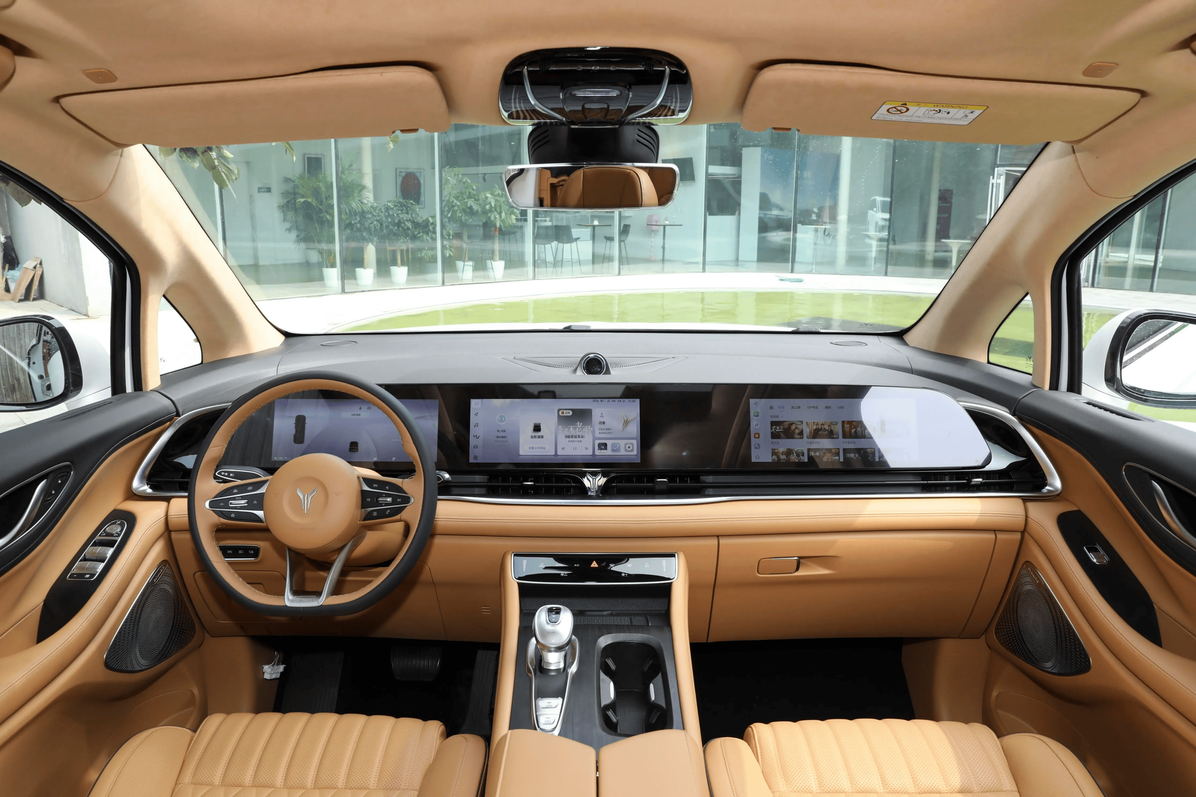 车内整体设计理念名为星环座舱,中控配备了12.8英寸曲面屏,采用OLED面板,倾斜角度为37度,可以提供更好的使用体验。在四幅式方向盘前面还配有弧形界面的23.6英寸Mini LED全液晶仪表盘与副驾娱乐屏,前方有70英寸的AR-HUD抬头显示,后排还有两块12.8英寸屏幕,支持多屏联动。