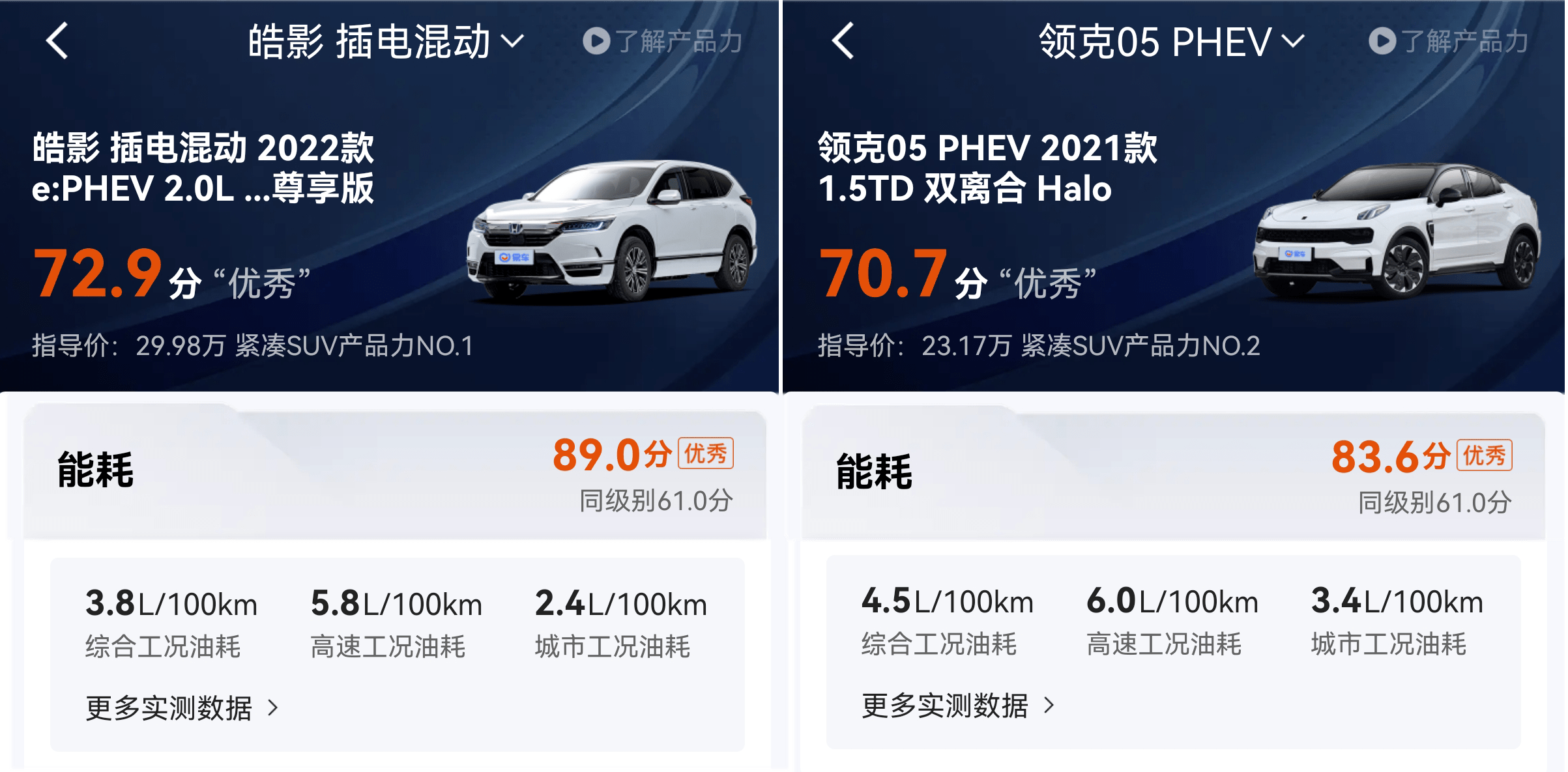 通过易车产品力实测榜单可以看到,本田皓影PHEV能耗的表现最为突出,超过同级车平均分28.0分。内饰的表现较为逊色,低于同级车平均分7.3分。而领克05 PHEV则在能耗的表现最为突出,超过同级车平均分22.6分。在空间的表现较为逊色,低于同级车平均分6.3分。