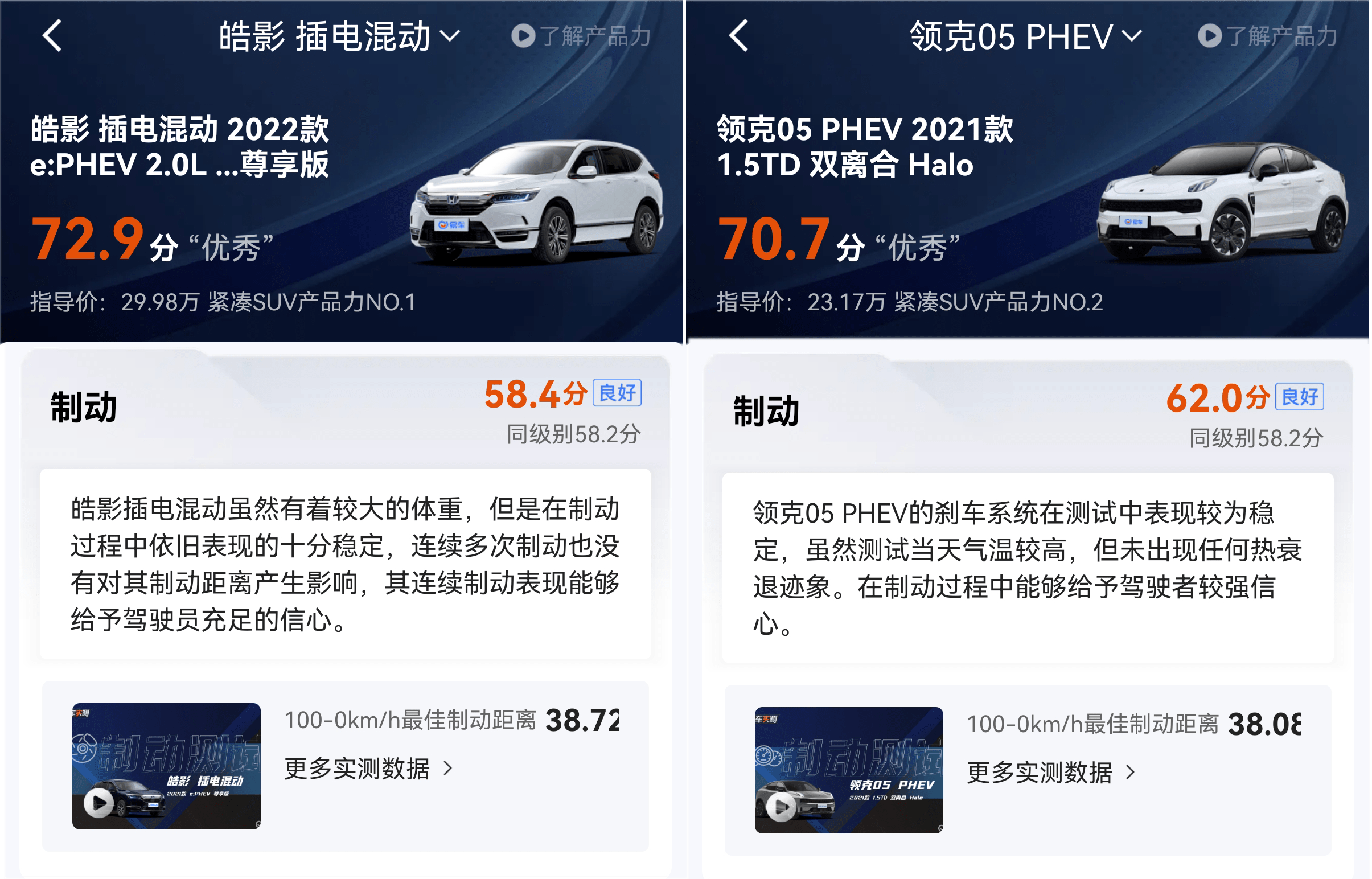 在制动方面,本田皓影PHEV从100-0km/h的最佳制动距离 38.72m,在实测中,皓影插电混动虽然有着较大的体重,但是在制动过程中依旧表现的十分稳定,连续多次制动也没有对其制动距离产生影响,其连续制动表现能够给予驾驶员充足的信心。而领克05 PHEV从100-0km/h的最佳制动距离38.08m,同时在实测中车辆的刹车系统整体表现较为稳定,虽然测试当天气温较高,但未出现任何热衰退迹象,在制动过程中能够给予驾驶者较强信心。