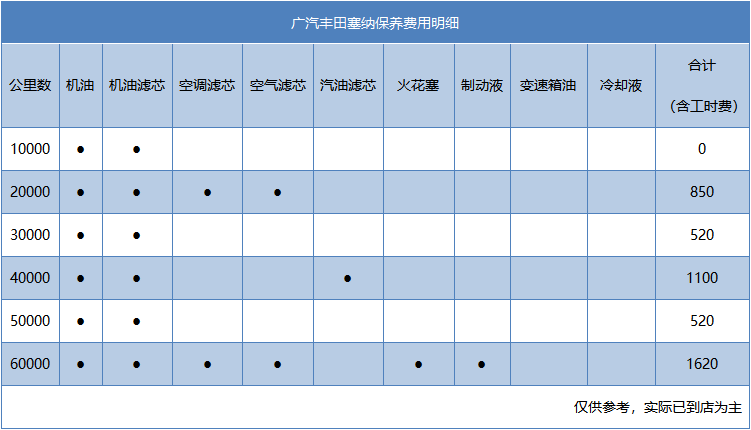 在保养费用方面,我们抛开厂家和经销商给出的一些保养优惠政策不谈。根据广汽丰田的保养手册显示,新款赛那的首保时间为10000公里,其首保免费,之后的保养间隔为同样为为10000公里。那么,如果大致按照6年总行驶60000万公里的情况下,新款总保养费用是4610元,以每年1万公里的驾驶里程计算,平均每一年成本约为768元。作为一款售价三四十万的中高端MPV车型而言,这个价格其实并不贵了。