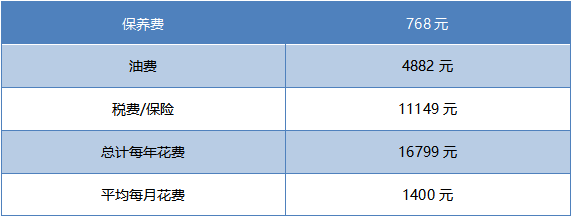 其次,保险缴纳车损险与第三者责任险100万再加不计免赔的计算方式,以及加上未出险情况下,保费第二年8折,第三年7折,取三年保费的平均值,这些条件一并来计算新款每年的用车成本总计为16799元,平均每月花费为1400元。具体如以下表格: