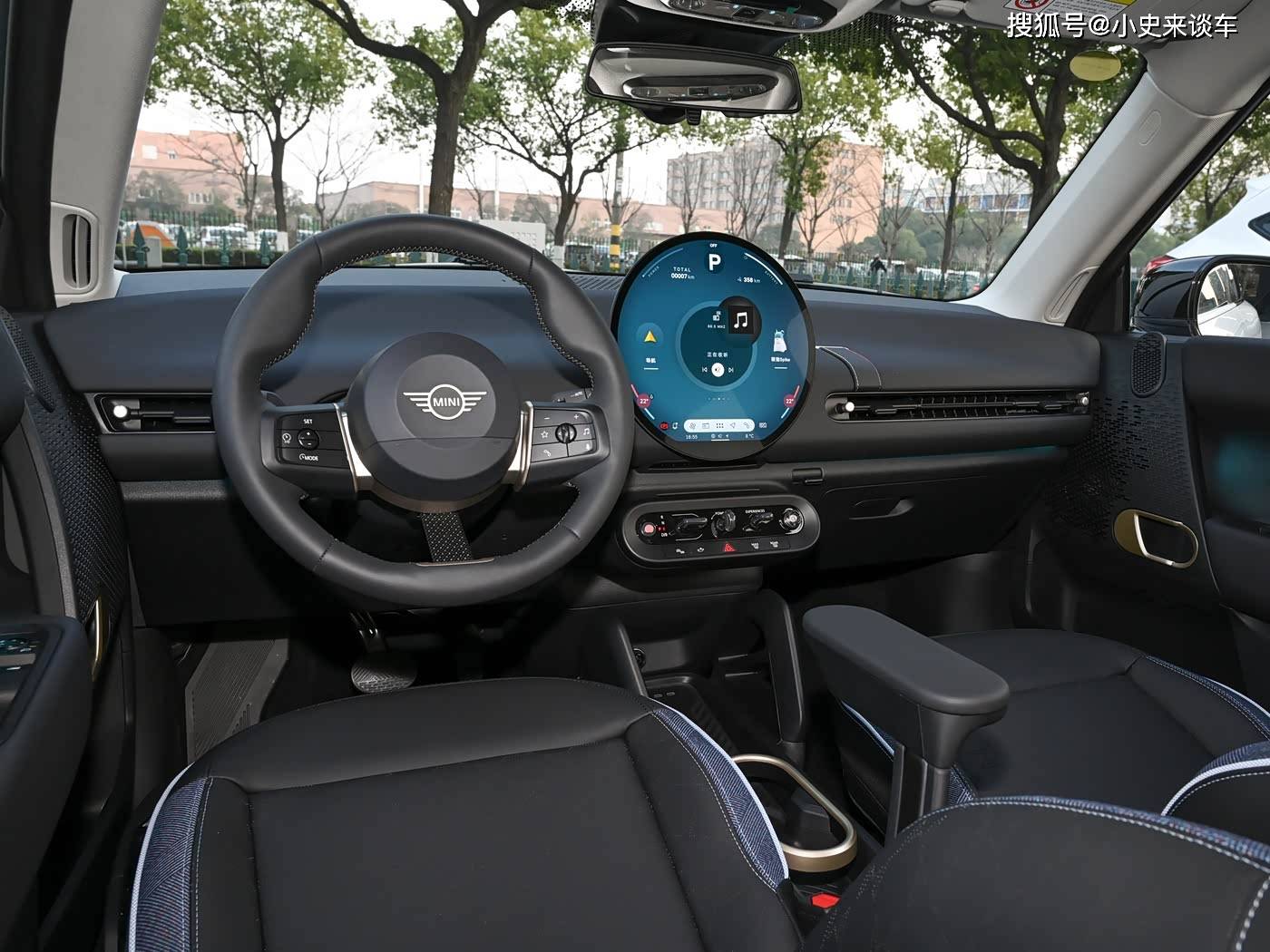 进入车内,内饰采用简约复古的设计风格,延续MINI家族的经典布局,同时融入数字化与运动化元素,营造出兼具质感与乐趣的座舱氛围[8][9]。中控台核心是行业内首个9.4英寸圆形OLED中控屏,直径240mm,显示效果鲜艳润泽,内置第九代MINI操作系统,界面设计贴合圆形屏幕,操作流畅顺滑。