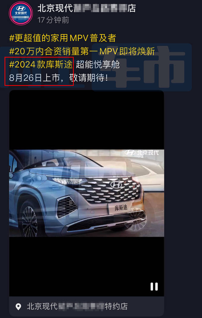 北京现代官宣:2024款库斯途8月26日上市!新车作为小改款变化不大,大家心心念的双联屏、混动系统都没有。
