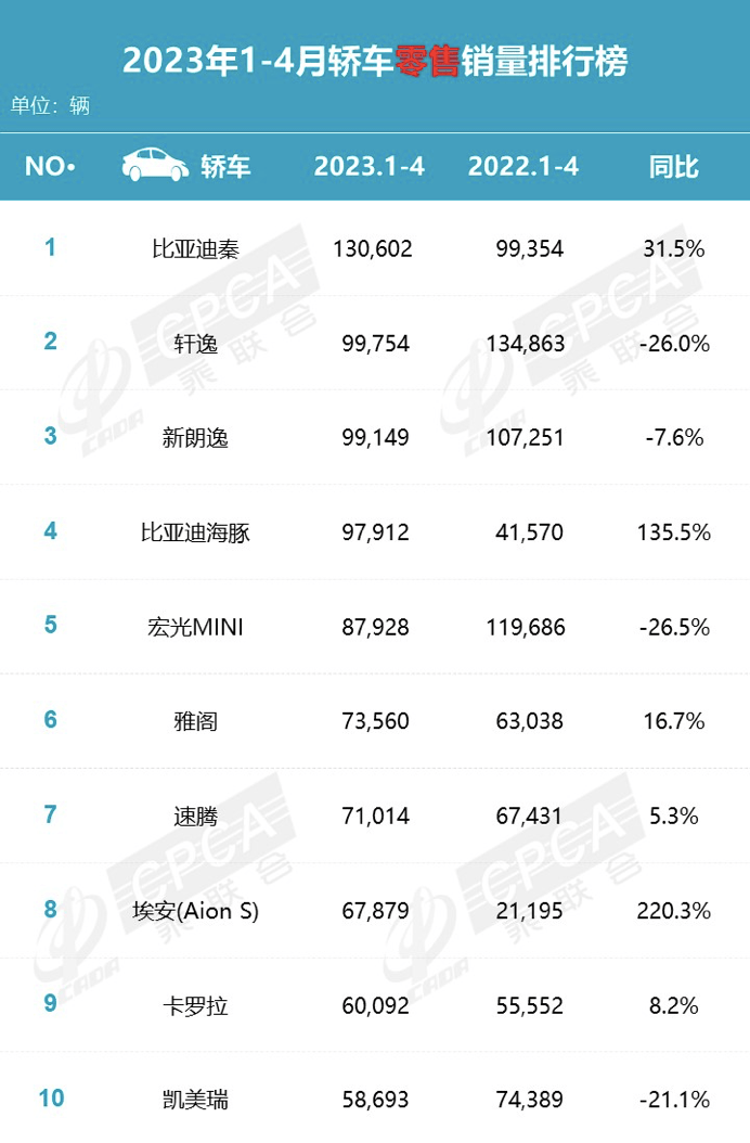 然而反观今年4月公布的轿车销量榜单来看,朗逸已被比亚迪秦稳稳的超越,甚至距离第四位的海豚也仅相差2千余辆,更何况朗逸1~4月同比还出现了下滑,因此未来朗逸主要竞争对手更有可能是轩逸。