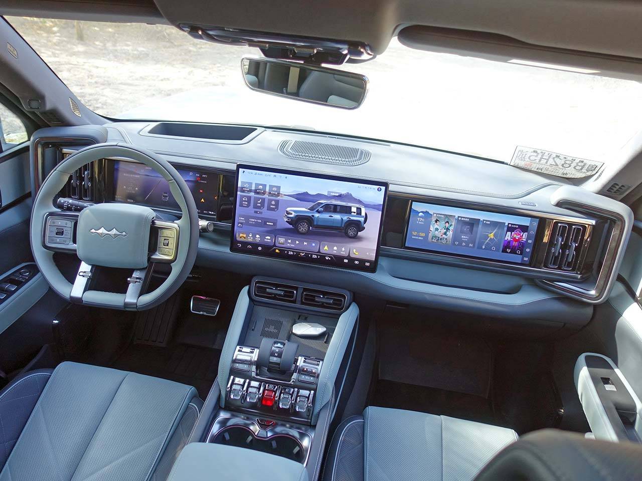 内饰方面,豹5既能看到硬派SUV的风格,细节上也能看到城市SUV的感觉。它配备有12.3英寸的全液晶仪表、15.6英寸的2.5k中央触控屏以及12.3英寸的副驾娱乐屏。电子换挡杆在每次车辆启动之后,会自动升起,确实挺有仪式感,换挡杆后面的水晶按键也给车内带来了一定的精致感。使用中会发现,它不仅保留了很多实体按键,每个按键的尺寸都挺大,这也是考虑到大家在戴手套之后,也能方便操作。