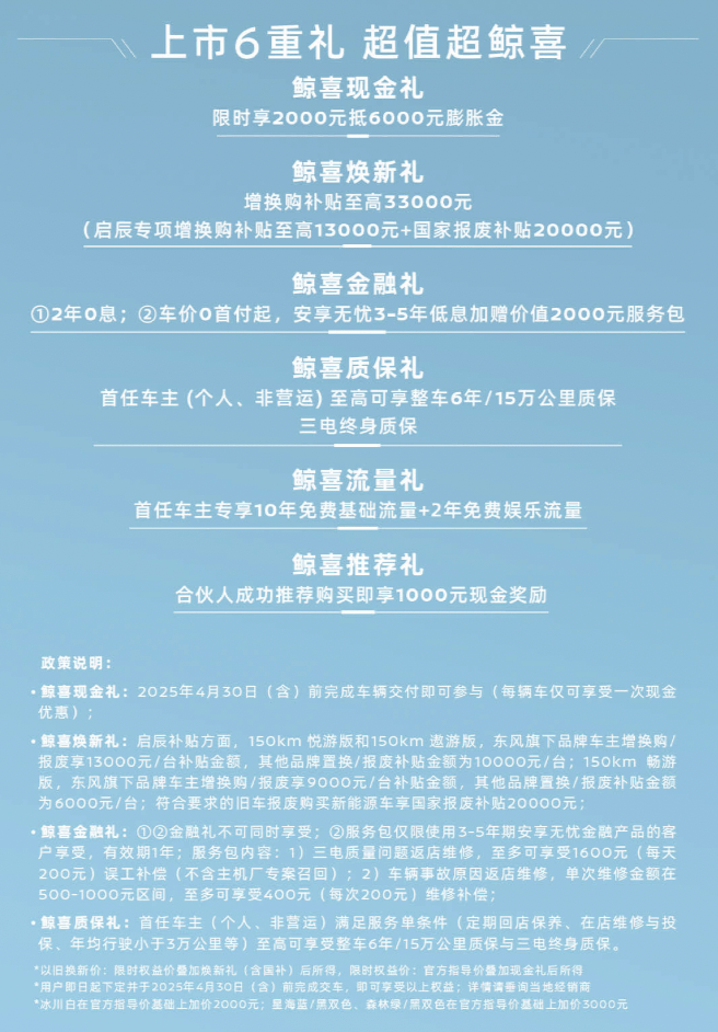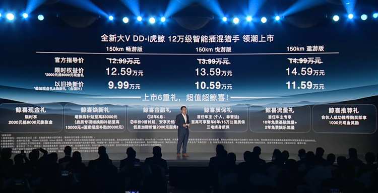 2025年2月28日,东风日产启辰官方宣布旗下的全新大V DD-i虎鲸正式上市,新车共推出3款车型,官方指导价12.99万至14.99万元。同时,该车推出限时权益价,价格区间为12.59万至14.59万元;以旧换新价9.99万至11.59万元。作为一款中期改款车型, 全新大V DD-i虎鲸主要是针对外观细节进行了升级,并采用的是插电式混动系统。