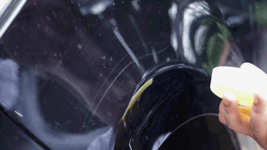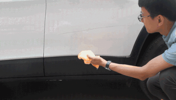 将划痕蜡挤在海绵上,沿着划痕的方向进行擦拭,不一会,显眼的剐蹭痕迹逐渐没有了。