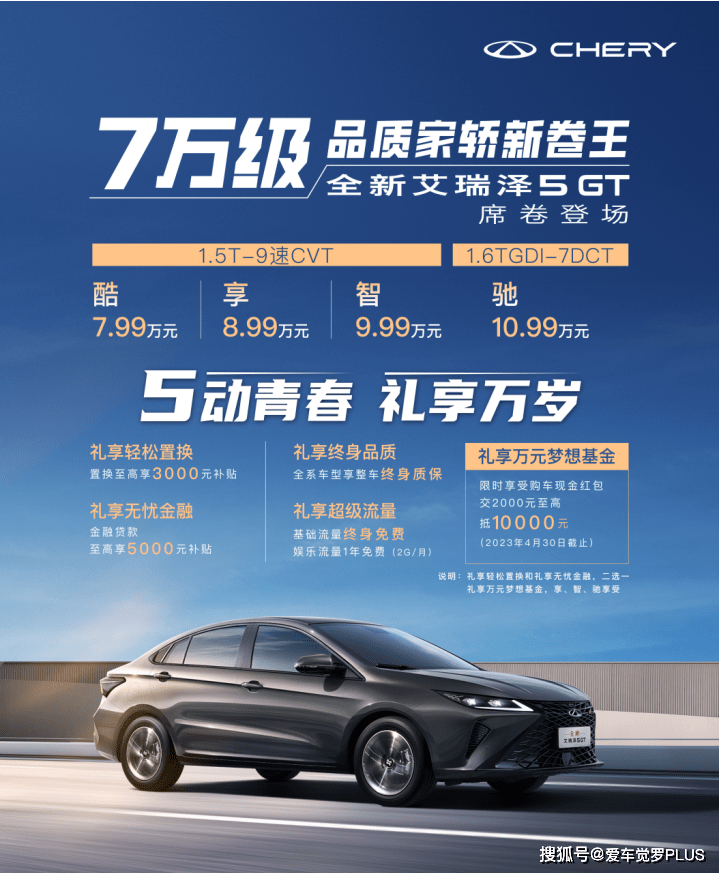 为让广大年轻用户轻松拥有高品质家轿,上市之际,奇瑞汽车推出“5动青春 礼享万岁”大礼包。其中:交2000元至高抵10000元(2023年4月30日截止)、置换至高享3000元补贴、基础流量终身免费,娱乐流量1年免费(2G/月)、全系车型享整车终身质保等。