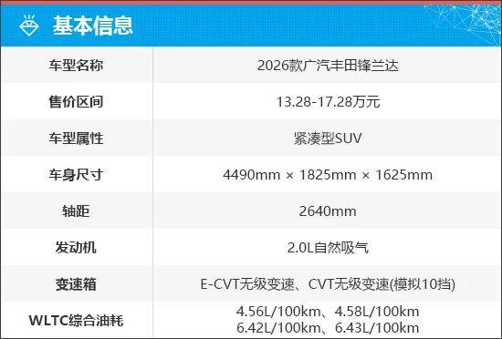 2026款广汽丰田锋兰达共推出9款车型,售价区间13.28-17.28万元,新车提供两种动力可选,外观采用丰田品牌全新设计语言,整体精致感和科技感均得到进一步提升。