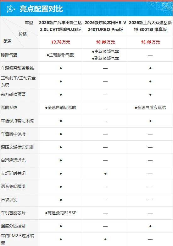 纵观国内合资紧凑型SUV市场,与2026款广汽丰田锋兰达(以下简称:丰田锋兰达)定位相近且价格相当的车型并不多,综合考虑销量、口碑和品牌形象等多方面因素,此次与丰田锋兰达进行对比的车型是2026款东风本田HR-V(以下简称:本田HR-V)和2026款上汽大众途岳新锐(以下简称:大众途岳新锐)。