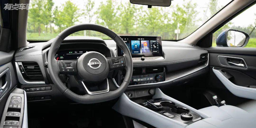 奇骏e-POWER提供了全新的云雾蓝内饰配色,并拥有蓝光LED氛围灯,对于内饰质感提升比较明显。12.3英寸的全液晶仪表盘与中控屏幕提供不错的显示效果,车机在流畅性和功能性上也无可挑剔。