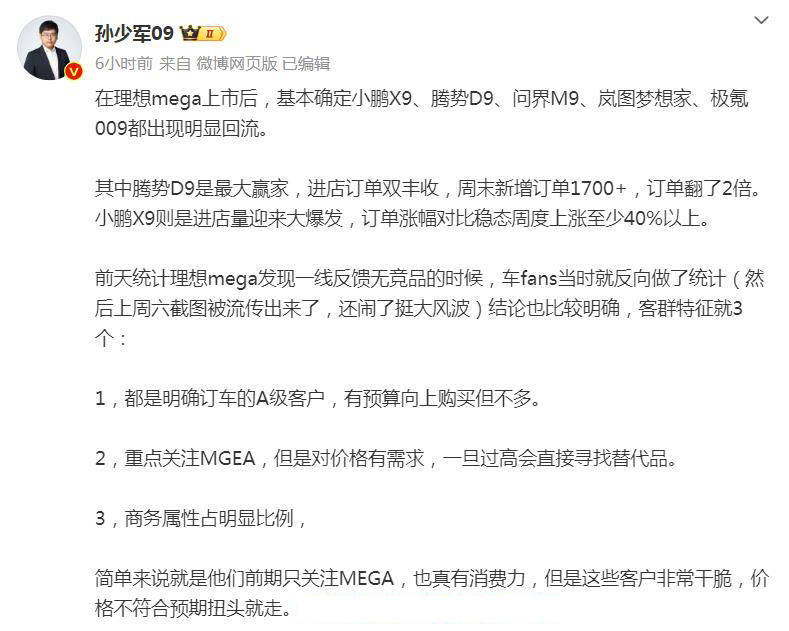 国内著名汽车博主孙少军在3月5日发布了关于理想MEGA和相关竞品的订单量走向,提到了一个非常有代表性的观点和趋势,那就是理想MEGA上市之后,其他大尺寸的国产MPV车型和SUV车型,订单量都出现了明显回流,比如小鹏X9、腾势D9、问界M9、岚图梦想家、极氪009等车型。