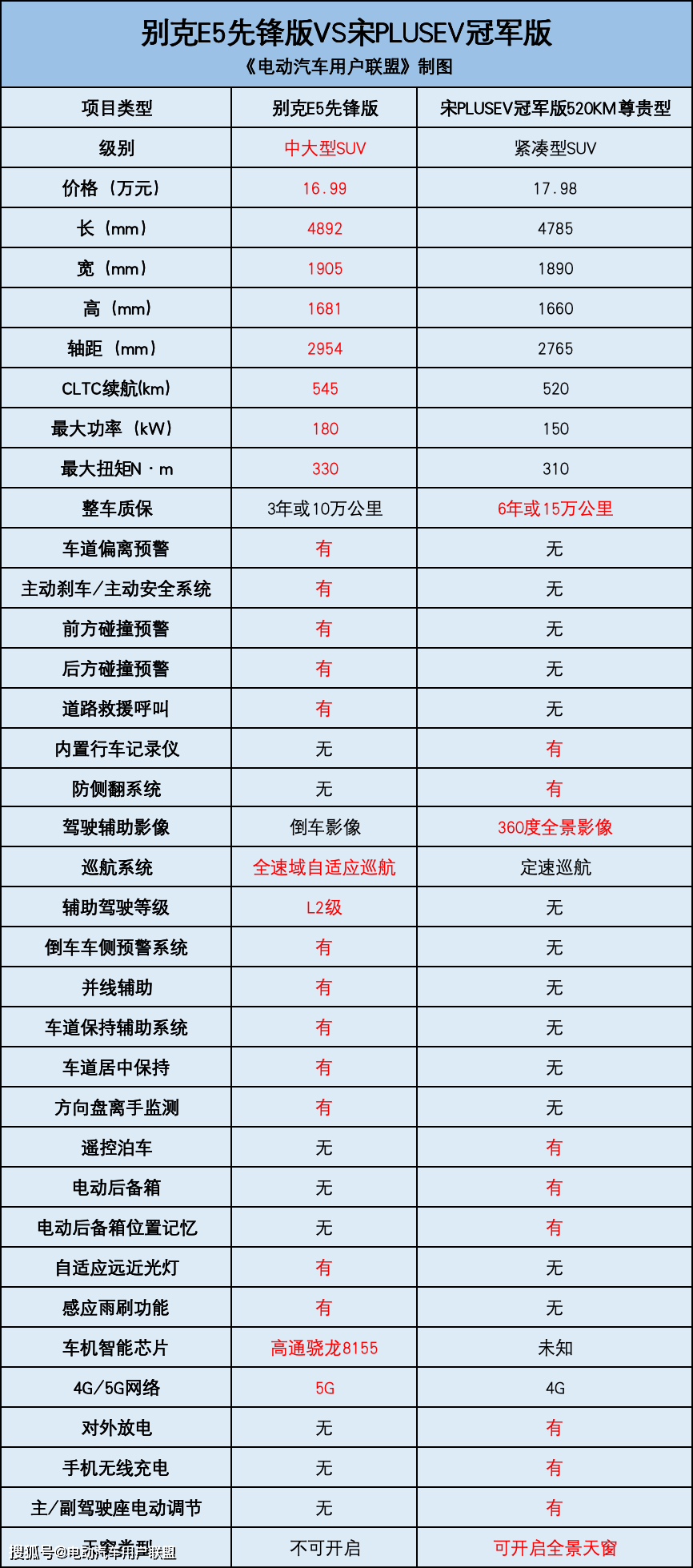 从上面这张图我们可以看到,别克E5先锋版的价格,比宋PLUS EV冠军版520KM尊贵型的价格少了1万元,但别克E5多个方面是碾压这位当红对手的: