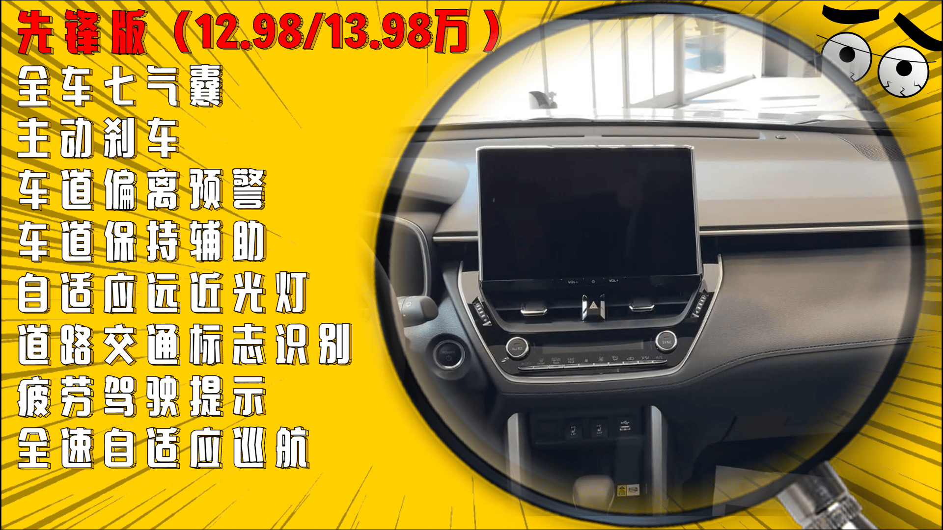 燃油和双擎动力,最入门的车型都是先锋版。配置方面也很类似,都配备了全车七气囊、主动刹车、自适应远近光灯、L2级别的驾驶辅助等安全配置,主被动安全性能 还是很全面的。舒适性配置略微欠缺,这车配备的是手动调节的布座椅,还配有7英寸的液晶仪表和10.25英寸中控屏幕、多功能方向盘、全车四扬声器、电子手刹,除此之外,配置就真没啥可说的了。卡罗拉锐放它就是一个工具车,,主动安全配置该有的都有了,那些花里胡哨的功能,也不是一款家用丰田车,该追求的东西。