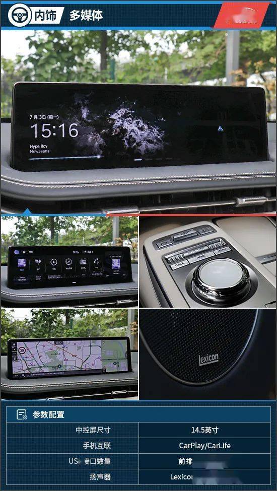 同时,旋钮式挡杆前方还配备了由按键、滚轮和旋钮组成的多媒体触控板,设计感十足且操作便捷,还能避免“搓屏幕”操作带来的满屏指纹,我个人还是很喜欢这种操作方式。此外,Lexicon莱斯康音响系统为高配车型专属,支持多种环绕声模式,丰富的细节使其更适合听器乐类的音乐,流行歌曲的话表现中规中矩,低音的氛围感出色,但下潜深度一般。