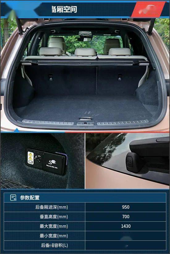 后尾门配备了脚部感应式开启功能,同时车尾的开启开关位于后雨刷底部,设计很有新意。后备厢内部较为规整,后排座椅支持4/6比例放倒,并且可以通过后备厢左右的快捷拉手进行操作。值得一提的是,在后备厢右侧还配备了一个250V,16A的车载电源,并且可以通过车钥匙锁闭盖板,以避免儿童误操作导致的伤害发生。