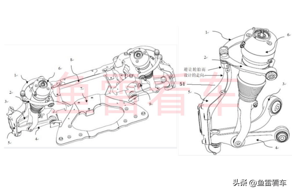 ▲ 上图为前悬结构图,带有空气悬架(专利申报)