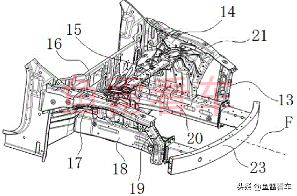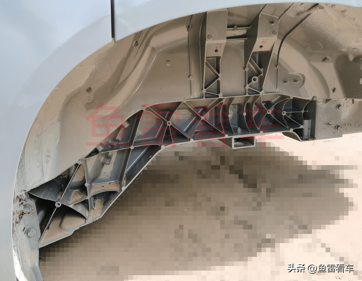 而外廓的轮罩总成加强结构强度,通过横梁连接到纵梁上不光是补强了纵梁强度,同时也能起到一定的抵御25%偏置碰增强的意图,最为关键的用词就是“结构工艺简单”,这也就意味着达到轻量化的前提下起到一定的补强作用,而纯电车型轻量化是最为重要的设计指标,电池组能量密度没有跨越式发展的前提下,整车轻量化自然也就成了重中之重了。
