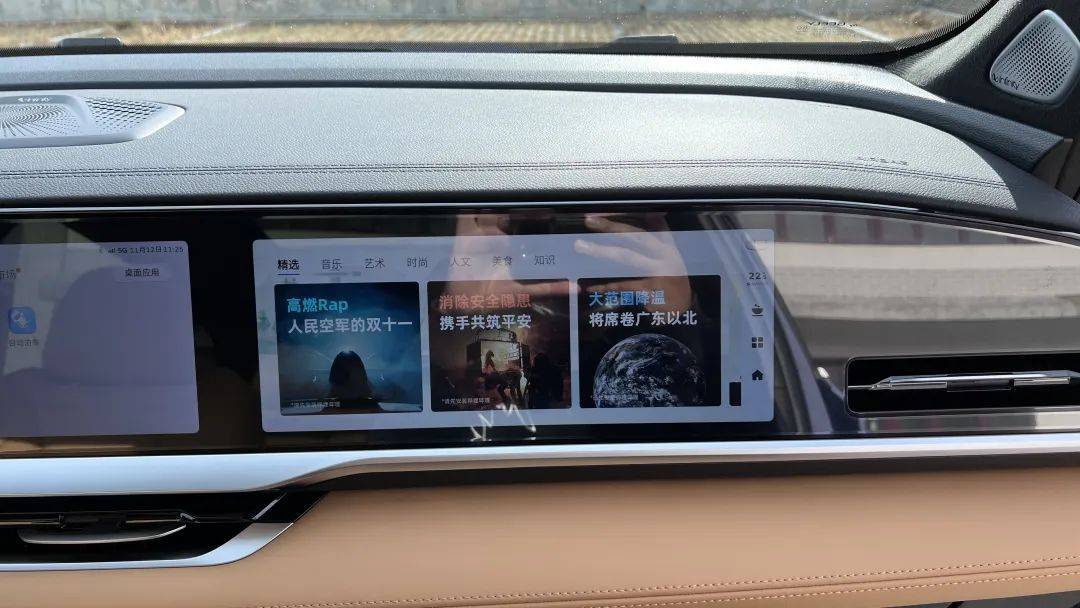 坐进车内,这款车双拼色的设计是比较吸引眼球的,配备了12.3英寸的液晶仪表、12.3英寸的中控屏和12.3英寸的副驾驶屏幕,体现出了很强的科技感,中控台下方保留了实体按键的操作区。值得一提的是,这款车配备的是真皮座椅和真皮方向盘,内饰也采用了大面积的皮质材料包裹。