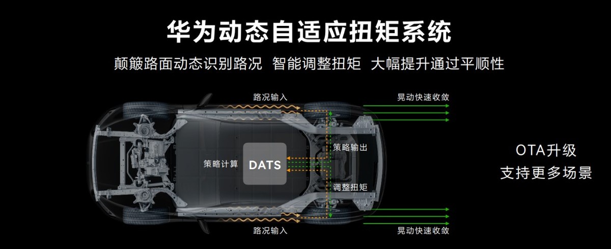 从技术上来说,HUAWEI DATS系统能够通过感知车轮与路面的动态接触情况进行策略计算,从而实现整车控制和扭矩动态自适应调节。对用户而言,HUAWEI DATS系统最直接的好处就是大大提升通过减速带、井盖等颠簸路面时的驾驶平顺性,并能降低能耗,提升续航能力。