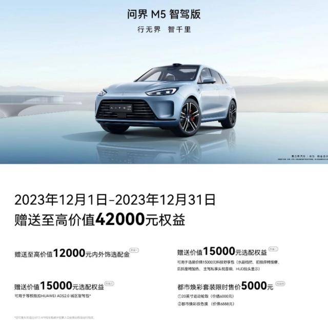 除了可靠的安全,强大的性能,问界M5还给了更大的诚意。2023年12月内入手问界M5,全系都可以在2周内提车,同时还将赠送价值1.2万元内外饰选配金以及价值1.5万元选配权益。此外,如果是智驾版用户,还额外有价值1.5万元选配权益可用于等额抵扣 ADS2.0 城区智驾包,权益价值至高达4.2万。