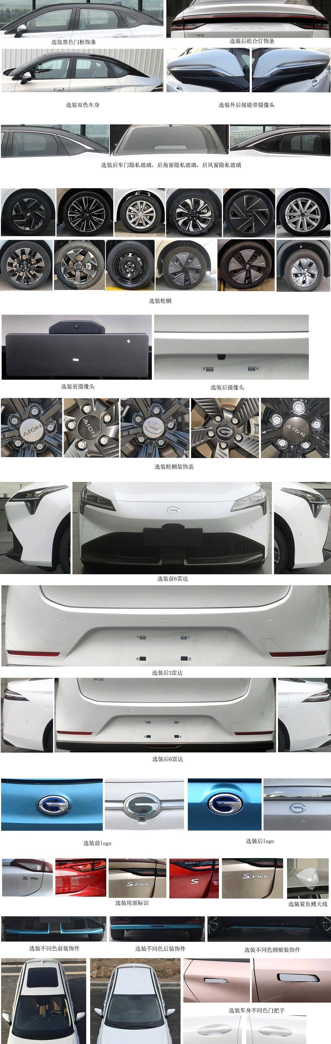 新车在外观方面将沿用AION S Plus的造型,基本上保持一致。前脸采用半包围设计,车尾采用贯穿式尾灯。不过,在配置方面提供了多种个性化的选择,比如:转向灯、双色车身、隐私玻璃、轮辋样式、前后摄像头等。