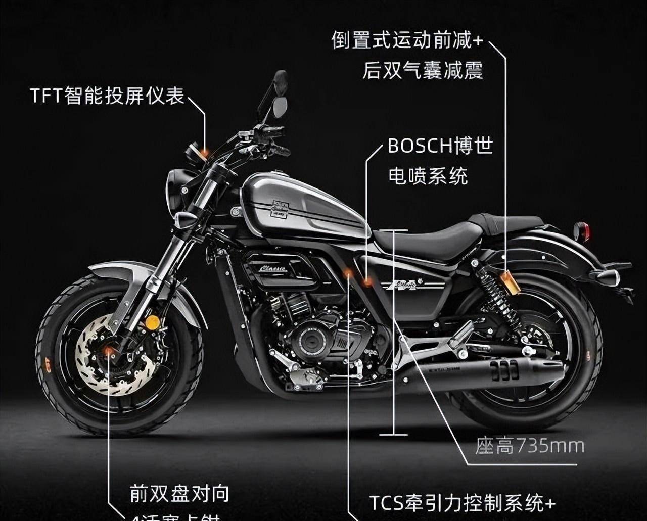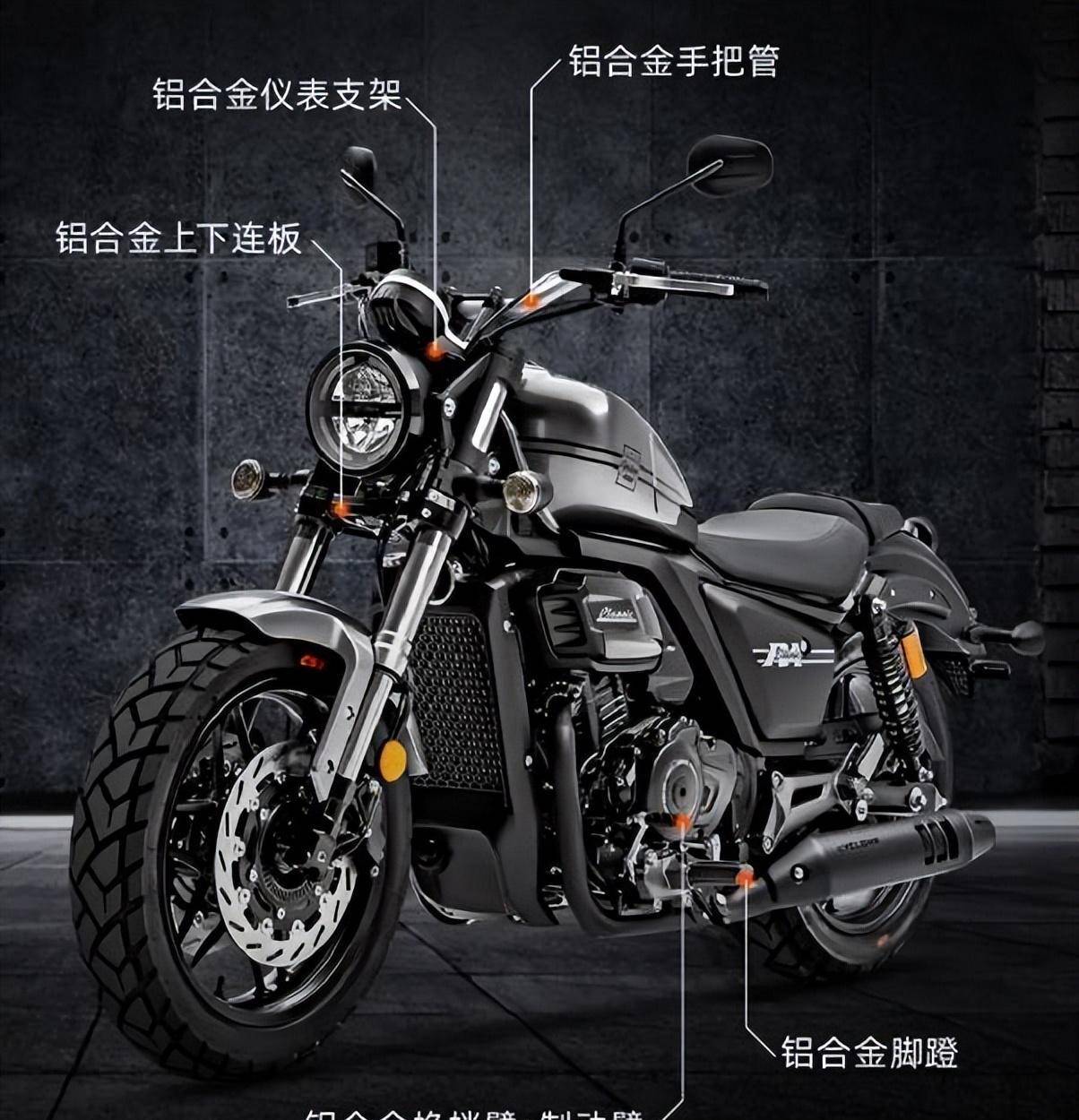 整车实现轻量化,重量188kg,大面积采用高性能铝合金组件,铝合金仪表支架,上下连板,铝合金手把管,换挡臂、制动臂以及脚蹬,整车更轻,操控更灵敏。
