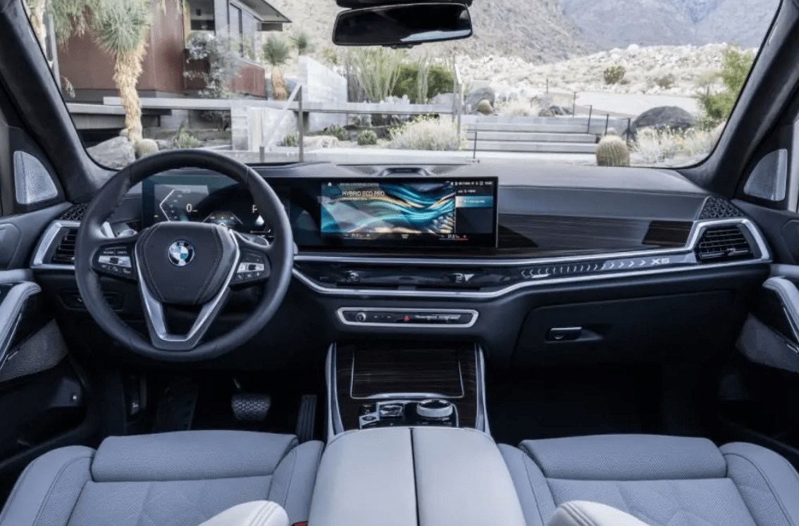 新款国产宝马X5的官图目前还没有曝光,不过依照此前曝光的谍照来看,中控区域会采用家族新一代造型,也就是类似新款宝马3系的矩形双联屏,科技感有一定提升。同时,新车的空调面板区域,包括空调出风口的造型则更接近新款7系。中控区域的实体按键有明显缩减,饰板融入了带箭头符号以及X5字样的氛围灯。不过小尺寸的换挡杆没有现款霸气。