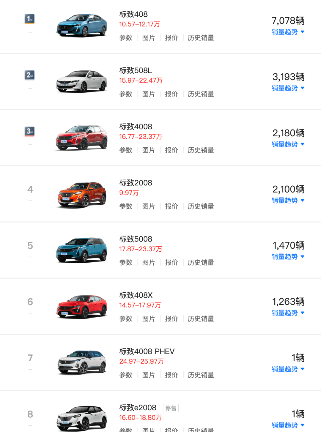 2020年9月26日是标致品牌成立的第210周年,但此时该品牌在中国市场的销量表现并不尽如人意,扭转销量的最佳表现就是推出一款重磅产品。目前,东风标致在售车型包括408/408X、508L、2008、4008、5008等,虽然产品丰富但市场表现一般,上半年东风标致累计销量为17286辆,其中标致408销量最高为7078辆。