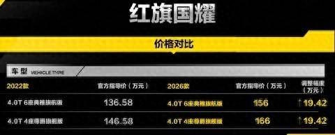 红旗汽车是大家熟知的自主豪华品牌,在很多人的心中有着非常高的地位。目前,从一汽红旗获悉,2026款红旗国耀正式上市,推出典雅旗航版(6座)和尊爵旗舰版(4座)两个款型,官方指导价分别为156万元和166万元,新车主要是对动力系统进行了升级,换装新4.0T V8发动机,继续匹配8AT变速箱,和2022款车型相比,2026款的指导价格分别上涨了19.42万元。