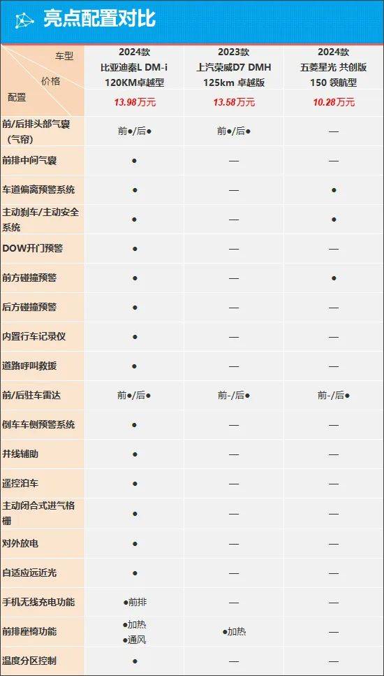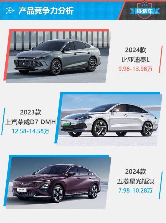 此次我们挑选了价格相近,且都定位中型车和采用插混系统的2023款上汽荣威D7 DMH(下文简称荣威D7 DMH)和2024款五菱星光插混(下文简称五菱星光插混)与2024款比亚迪秦L(下文简称比亚迪秦L)进行比较。
