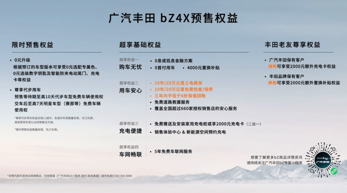 与此同时,广汽丰田bZ4X还为车主提供了一系列的售后保障及丰富的购车权益,旨在为顾客提供多样化的购车选择、以及更安心的用车体验。在遍布全国的超660家广汽丰田经销店,bZ4X都可以获得10年或20万公里三电质保、10年或20万公里免费检查/保养、三年内不低于6折保值回购、免费赠送及安装家用充电桩或享2000元充电卡(二选一)、以及5年免费车联网服务等等众多超享权益。