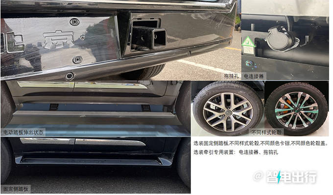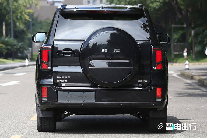 北京BJ60e前格栅采用横置镀铬条,格栅边框被LED灯组包围,两侧灯组为分体式设计。尾部配有平开门,并搭载外挂式备胎。