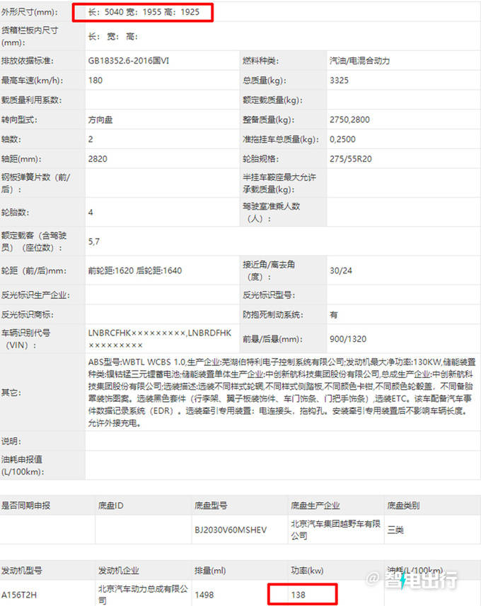 智电出行获得了北京BJ60e的实拍图和部分信息。新车长宽高5040/1955/1925mm,轴距2820mm,和燃油版一致。BJ60e搭载型号为A156T2H的1.5T混动专用发动机,最大功率138kW,预计将于2024年上市,未来将主要与坦克500 Hi4-T竞争。