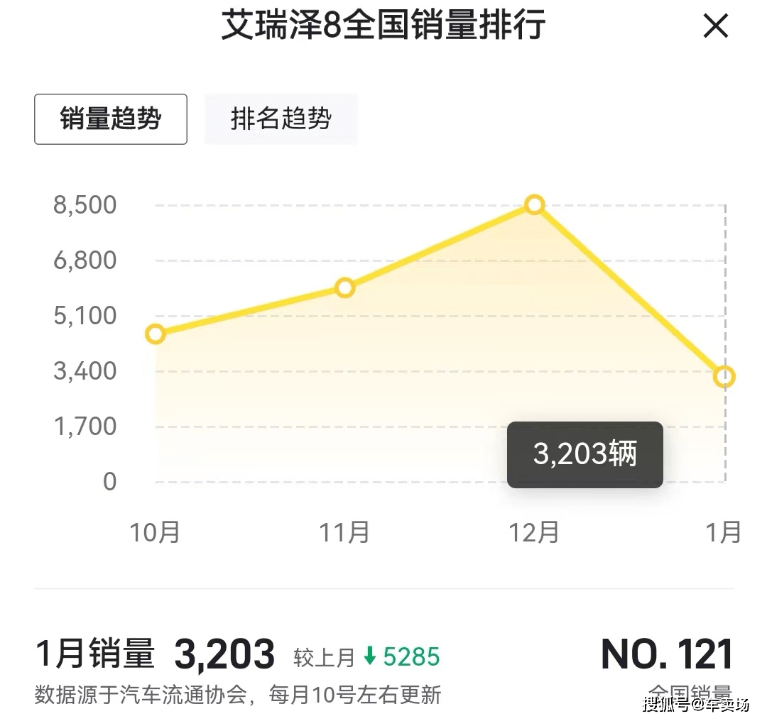 去年有政策加持都没能卖到预期,何况今年没了政策同时在其他车型都大降价的背景下奇瑞艾瑞泽8也没降价,这怎么可能卖的动呢?整不好2月份销量会继续走低!