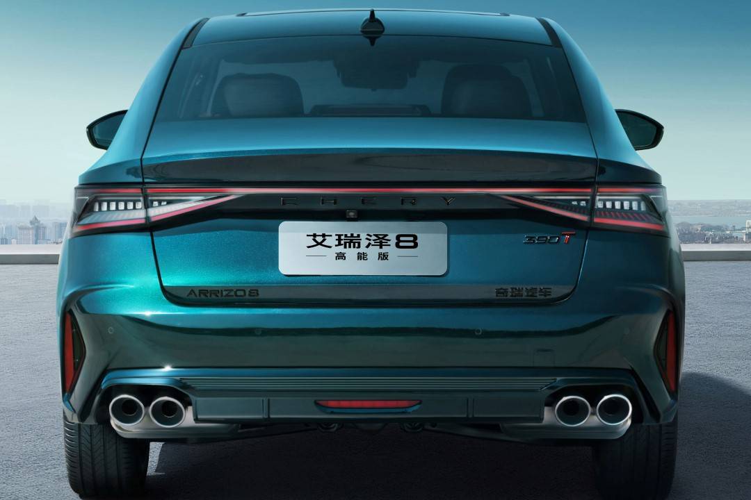 车尾部分,艾瑞泽8高能版采用时下流行的贯穿式后尾灯组,并将“CHERY”字样融入其中,视觉效果较为精致。同时新车利用后备厢盖末端的上翘曲线,以及后包围下部的双边共四出排气,来进一步提升整车的运动感,宣示了它内在不凡的动力水准。