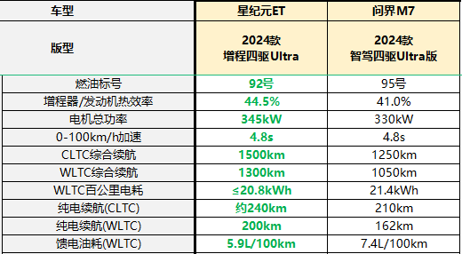 星纪元ET的黄金增程系统由黄金发动机、黄金发电机和黄金三电组成,实现了行业量产最高的44.5%热效率,1L油发电3.7kWh,行业领先。这一系统在多次极限续航挑战中屡创佳绩,如从芜湖到徐闻港再折返广州的2141.4km极限长续航,以及100元挑战上海到芜湖350km城际续航的壮举。特别是在极寒条件下,星纪元ET增程四驱在哈尔滨-北京的高速智驾续航挑战中,实现了93.5%的续航达成率,全程0补能,充分展示了其强大的续航能力和智驾性能。相比之下,问界M7虽然也具备一定的续航能力,但在极限条件下的表现以及智驾系统的成熟度上,与星纪元ET相比仍存在一定的差距。