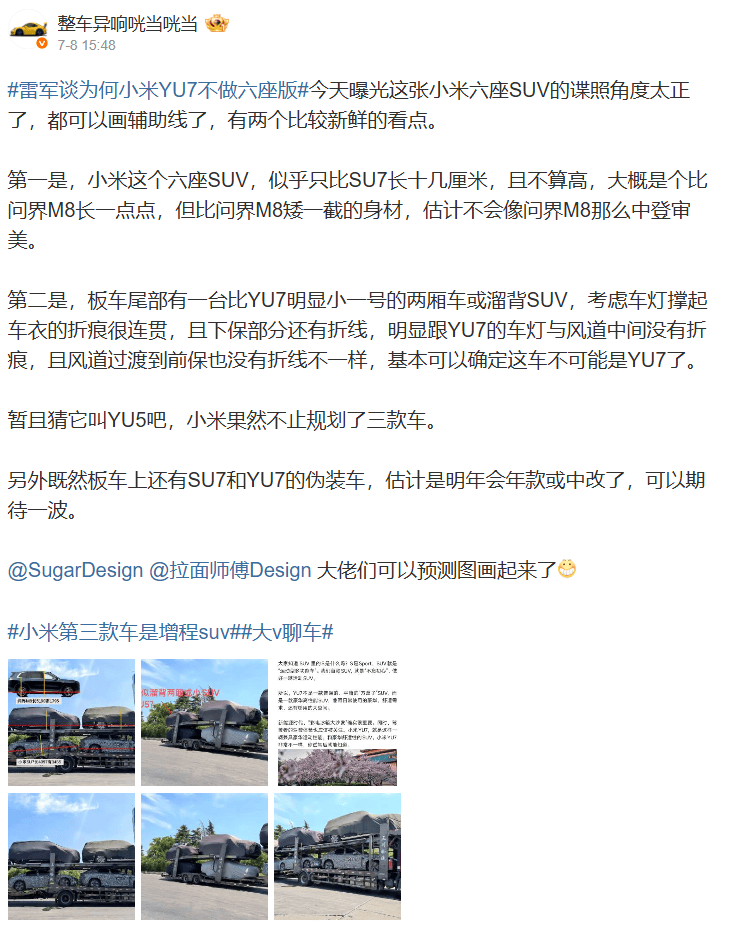 当然,这一切的前提是:车本身得足够好,产能得足够稳。 如果雷军能搞定这两点,那小米汽车或许真能成为下一个“大爆款”。至于消费者?准备好钱包,等着“年轻人的第一台增程SUV”或者“电动小钢炮”吧!