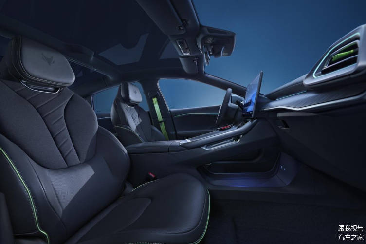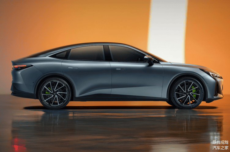 从侧面来看,极狐阿尔法S5采用溜背式设计风格,还配备双色车身、无边框车门和隐藏式门把手,配合19寸运动轮毂和荧光绿的刹车卡钳,进一步提升了运动氛围。