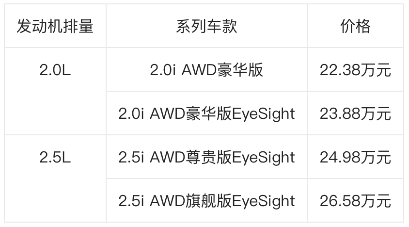 ◆2.5L车型(2.5i AWD尊贵版EyeSight\2.5i AWD旗舰版EyeSight)开启预售。