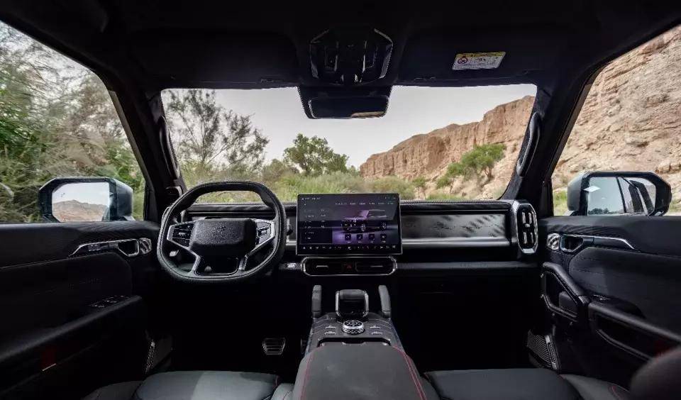 但同时,这款SUV也不是传统硬派的简单粗暴的逻辑,这款车的内饰硬朗的同时,也注重舒适性和科技感,中控大屏尺寸相当大,核心搭载高通骁龙8155芯片,支持L2.5级智能辅助驾驶能力以及最新的智能科技配置。